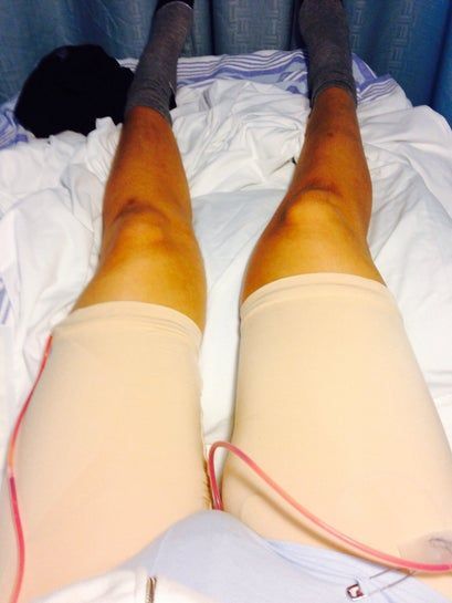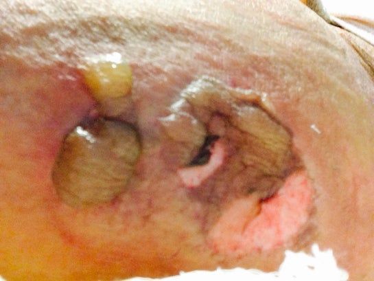 Da tôi bị phồng rộp chỉ 10 tiếng sau hút mỡ đùi trong, đó là ca phẫu thuật duy nhất mà tôi thực hiện. Những vết phồng rộp dần bong tróc, rồi da chuyển sang màu đen chỉ trong vòng 2-3 tiếng kể từ khi nó xuất hiện. Tôi bị sưng đỏ và sưng mô sâu từ bên dưới. Sang ngày thứ 4 thì sưng toàn bộ đùi. Ca hút mỡ không dùng laser hay nhiệt nên không thể là bỏng. Bác sĩ nghi là viêm mô tế bào nhưng kết quả nuôi cấy đều cho âm tính.