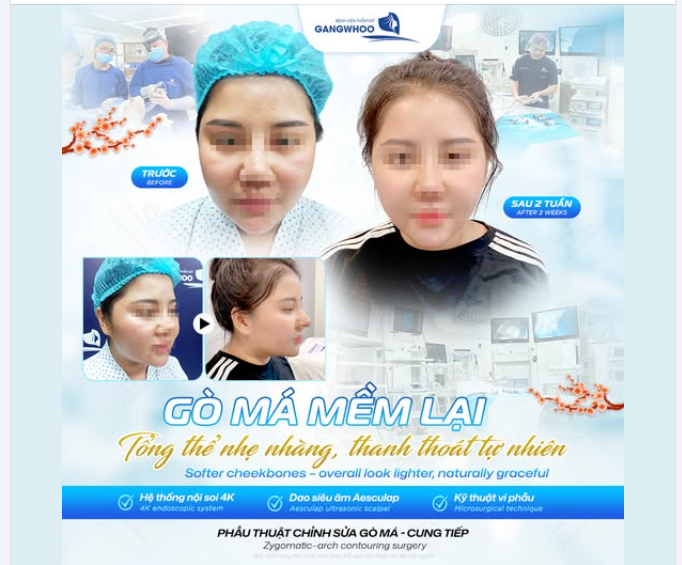 Đôi khi, sự sắc sảo quá mức từ đôi gò má cao lại vô tình khiến ánh nhìn trở nên nghiêm nghị và khó gần. Tại Gangwhoo, kỹ thuật hạ gò má – cung tiếp không chỉ đơn thuần là thu gọn xương, mà là nghệ thuật tinh chỉnh để các đường nét trở nên "mềm" đi. Khi gò má được hạ về đúng tỉ lệ, gương mặt sẽ lấy lại sự cân đối, giúp ánh nhìn trở nên dịu dàng, phúc hậu và toát lên thần thái tự nhiên, đầy cuốn hút.