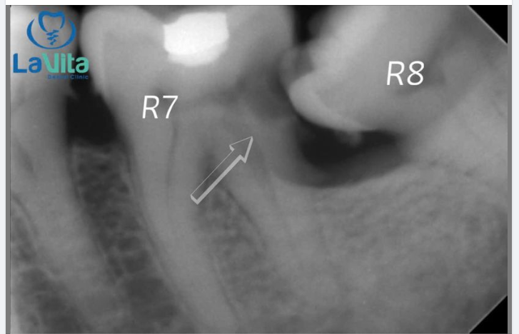 Răng khôn chưa gây biến chứng nhưng có khe giắt giữa răng khôn và răng bên cạnh, sẽ sớm ảnh hưởng đến răng bên cạnh.