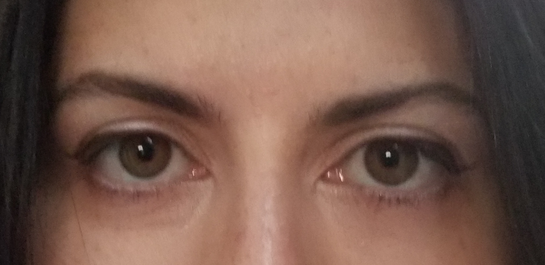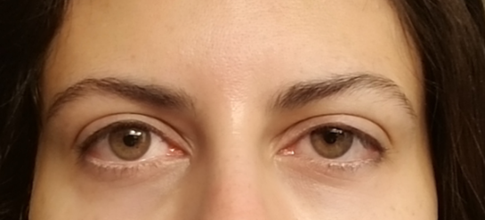 Phần trong của lông mày sụp xuống, phần ngoài nhô lên sau tiêm botox xóa nếp nhăn trán và nếp cau mày