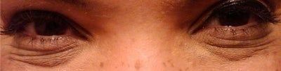 Tôi mới bước sang tuổi 40 và vùng bên dưới mắt đã bị nhăn nheo khủng khiếp rồi. Lúc không cười thì các nếp nhăn chỉ hơi mờ mờ thôi còn khi cười thì nếp nhăn hằn rất rõ (như ảnh). Mỗi khi trang điểm là kem nền lại đọng lại trong nếp nhăn, nhìn rất xấu. Tôi nên làm thế nào bây giờ? Tiêm Restylane, Botox hay điều trị bằng laser?