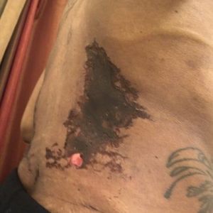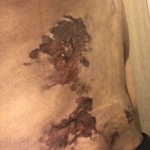 Thật không may chuyện này lại xảy ra sau hút mỡ. Vùng trông có vẻ như bị bầm tím này thực ra là dấu hiệu của hoại tử da. Có nghĩa là có tổn thương bên dưới da, xảy ra trong quá trình làm hút mỡ. Lúc này, bạn cần yêu cầu chăm sóc vết thương và có thể là cắt bỏ da hoại tử.