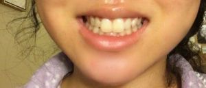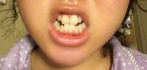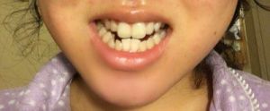 Vấn đề của bạn là cung hàm trên kém phát triển nghiêm trọng nên bị hẹp, khi cười hầu như chỉ lộ ra hai chiếc răng cửa. Và đây cũng là lí do khiến cho hai chiếc răng có vẻ to hơn hẳn so với các răng còn lại và còn làm cho các răng ở hàm dưới lại đều mọc hướng vào bên trong.