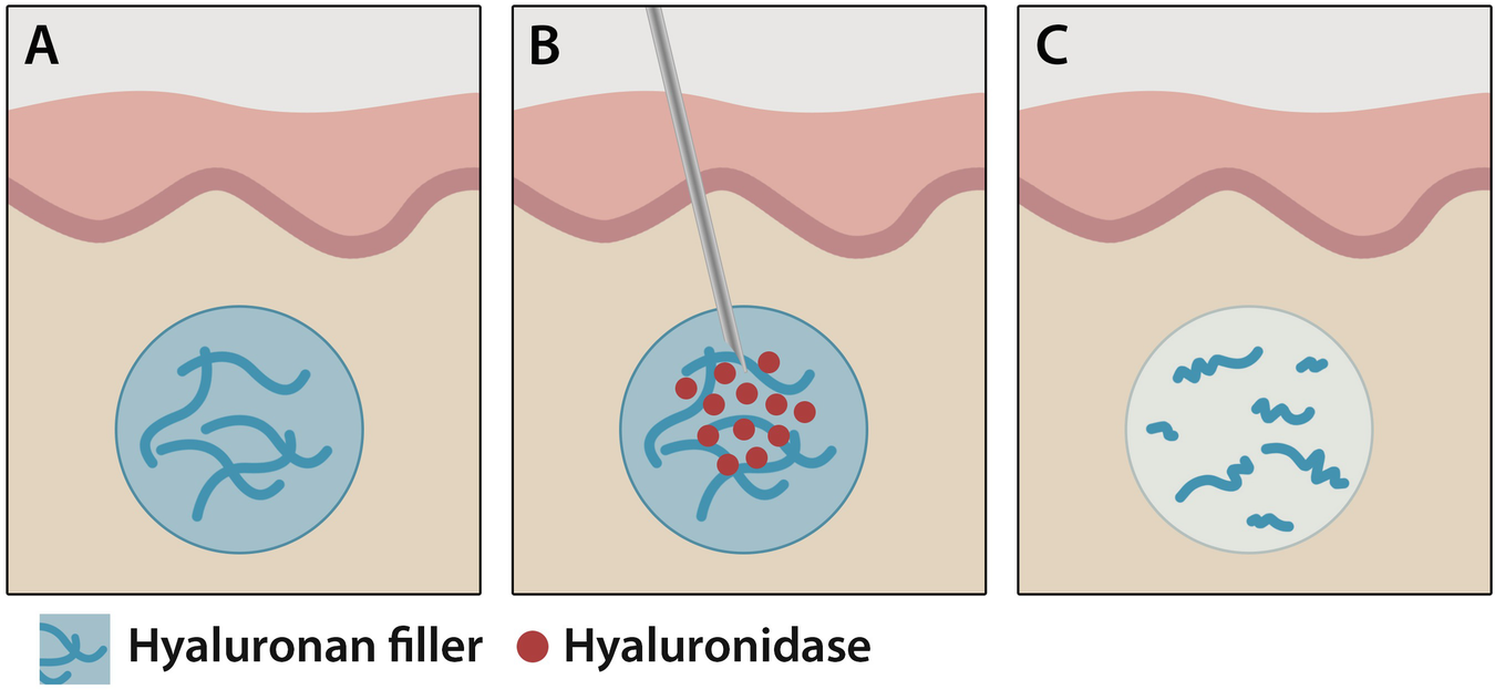 Hyaluronidase là các enzym (endoglycosidases) có thể phá vỡ liên kết và phân hủy hyaluronic acid bằng cách thủy phân các disaccarit tại hexosaminidic β-1 qua các liên kết β-4. Ban đầu, hyaluronidase được cấp phép sử dụng để tăng độ thẩm thấu của các loại thuốc tiêm dưới da hoặc tiêm bắp, thuốc tê tại chỗ, dịch truyền dưới da và thúc đẩy sự tái hấp thu của chất dịch thừa cũng như là máu. Hiện nay, hyaluronidase còn được sử dụng dưới hình thức “off-label” (có nghĩa là chưa được chính thức cấp phép) để làm tan chất làm đầy (tiêm tan filler) trong những trường hợp xảy ra vấn đề không mong muốn như tổn thương mạch máu do vô ý tiêm chất làm đầy vào tĩnh mạch hoặc lực chèn ép từ bên ngoài, điều chỉnh khi tiêm quá nhiều, không cân đối và vón cục hoặc nổi nốt sần do tiêm chất làm đầy hyaluronic acid.