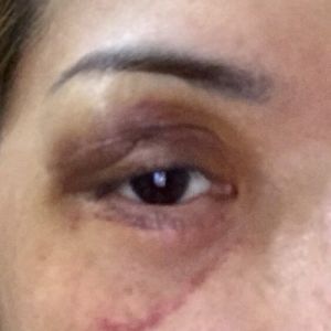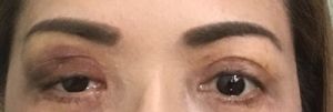 Đúng là bạn có một khối máu tụ ở mí trên bên phải. Tụ máu là tình trạng một lượng máu tụ lại do chảy máu dưới da hoặc xuất huyết hốc mắt và có thể cần phải loại bỏ. Trong trường hợp của bạn, ngoài khối máu tụ còn bị bầm tím quanh cả hai bên mắt. Máu tụ có thể xảy ra trong vài ngày đầu sau phẫu thuật, phổ biến hơn ở những người trước phẫu thuật có sử dụng các loại thuốc như aspirin, ibuprofen, naproxen hoặc các thực phẩm bổ sung làm tăng nguy cơ chảy máu như dầu cá. Trước phẫu thuật các bệnh nhân thường được cung cấp một danh sách các thực phẩm như vậy. Tai nạn hoặc chấn thương ở mắt sau phẫu thuật cũng có thể là gây tụ máu.