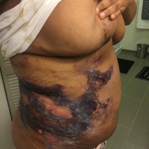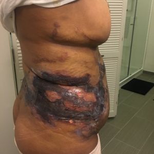 Sưng nề và bầm tím là chuyện bình thường sau hút mỡ. Tuy nhiên nhìn từ ảnh trông không giống như bầm tím. Có vẻ như phần da sậm màu của bạn là vùng đã bị tổn thương và hoại tử. Hiện tượng này cần được điều trị khẩn cấp bởi một bác sĩ có kinh nghiệm trong việc chăm sóc vết thương và hạn chế sẹo (thường là bác sĩ chuyên khoa lành vết thương, bác sĩ bỏng). Bạn nên đặt lịch khám trực tiếp với một bác sĩ có chuyên môn về lành vết thương ngay lập tức để đảm bảo được chăm sóc y tế đúng cách và theo dõi sát sao trong quá trình hồi phục.