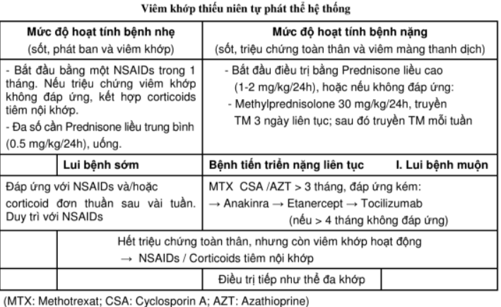 − Trẻ viêm khớp thiếu niên tự phát thể hệ thống thường có bệnh cảnh cấp tính nặng cần phải nhập viện. Điều trị nhằm làm giảm các triệu chứng viêm tại khớp và phản ứng viêm lan tỏa ngoài khớp. Thuốc điều trị được lựa chọn tùy thuộc vào mức độ nặng của hoạt tính bệnh.