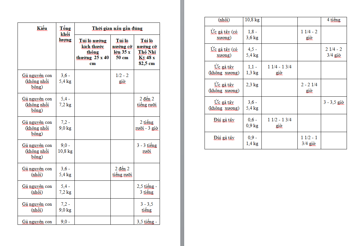 | Cân nặng | Thời gian nấu gần đúng nhiệt độ bên trong |