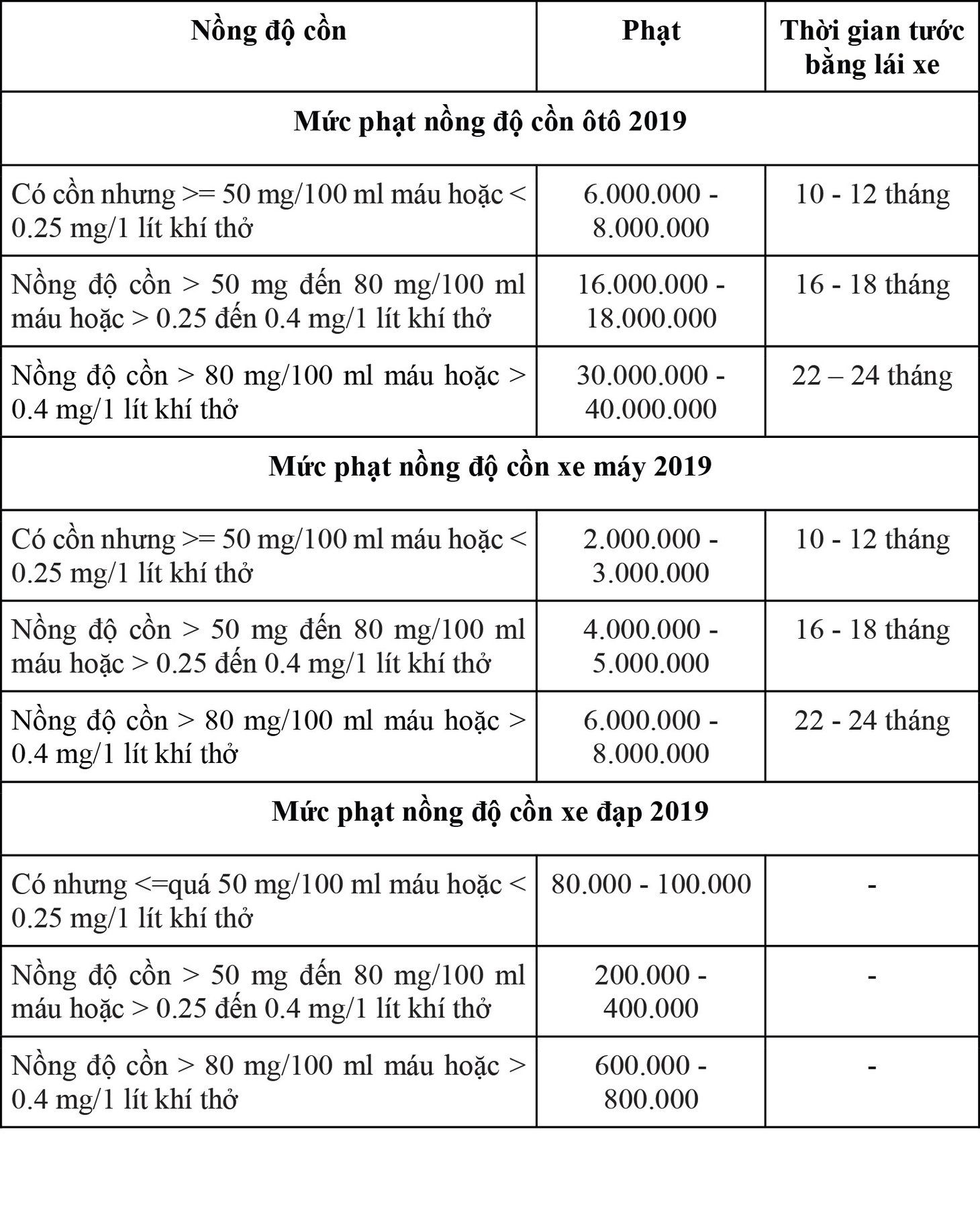 Theo Luật Phòng, chống tác hại của rượu, bia (Luật số 44/2019/QH14) và Nghị định số 100/2019/NĐ-CP vừa được ban hành, thì kể từ ngày 1/1/2020, Việt Nam sẽ cấm triệt để hành vi điều khiển các phương tiện giao thông (bao gồm cả ôtô, xe máy, xe đạp điện...) khi có nồng độ cồn trong hơi thở, trong máu. Cụ thể mức nồng độ cồn và mức phạt nồng độ cồn 2019 như sau: