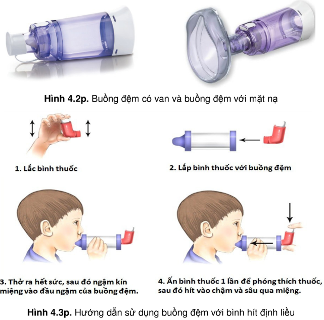 - Kỹ thuật: gần tương tự như trên, chỉ khác là thay vào việc ngậm trực tiếp vào đầu buồng đệm, bệnh nhi hít thuốc qua mặt nạ nối với buồng đệm.