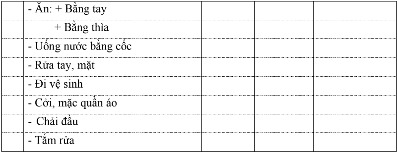 - Kỹ năng sinh hoạt hàng ngày bao gồm các hoạt động: Ăn uống, Tắm rửa, cởi và mặc quần áo, đi vệ sinh...