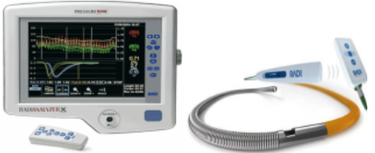 - Dụng cụ (hệ thống máy) đo FFR (hình 1.A.): gồm bộ phận xử lý thông tin gắn liền màn hình hiển thị các đường áp lực (monitor). Máy có thể cho phép hiển thị nhiều đường áp lực cùng một lúc và hệ phần mềm phân tích các thông số về áp lực cũng như các thông số đã được tính toán như (Dp/Dt; FFR…). Các thông số và đường biểu diễn áp lực có thể được ghi chép lại và lưu trong bộ nhớ để xem lại và xử lý số liệu khi cần thiết.