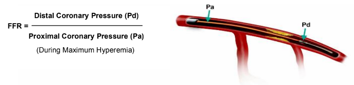 Hình 2. Sơ đồ cách tính FFR được đo bằng áp lực đoạn xa sau chỗ hẹp chia cho áp lực đoạn gần ngay đầu ống thông trong tình trạng hệ thống mao mạch được giãn tối đa để loại trừ trở kháng hệ mao mạch, như vậy sẽ phản ánh dự trữ lưu lượng dòng chảy động mạch vành.