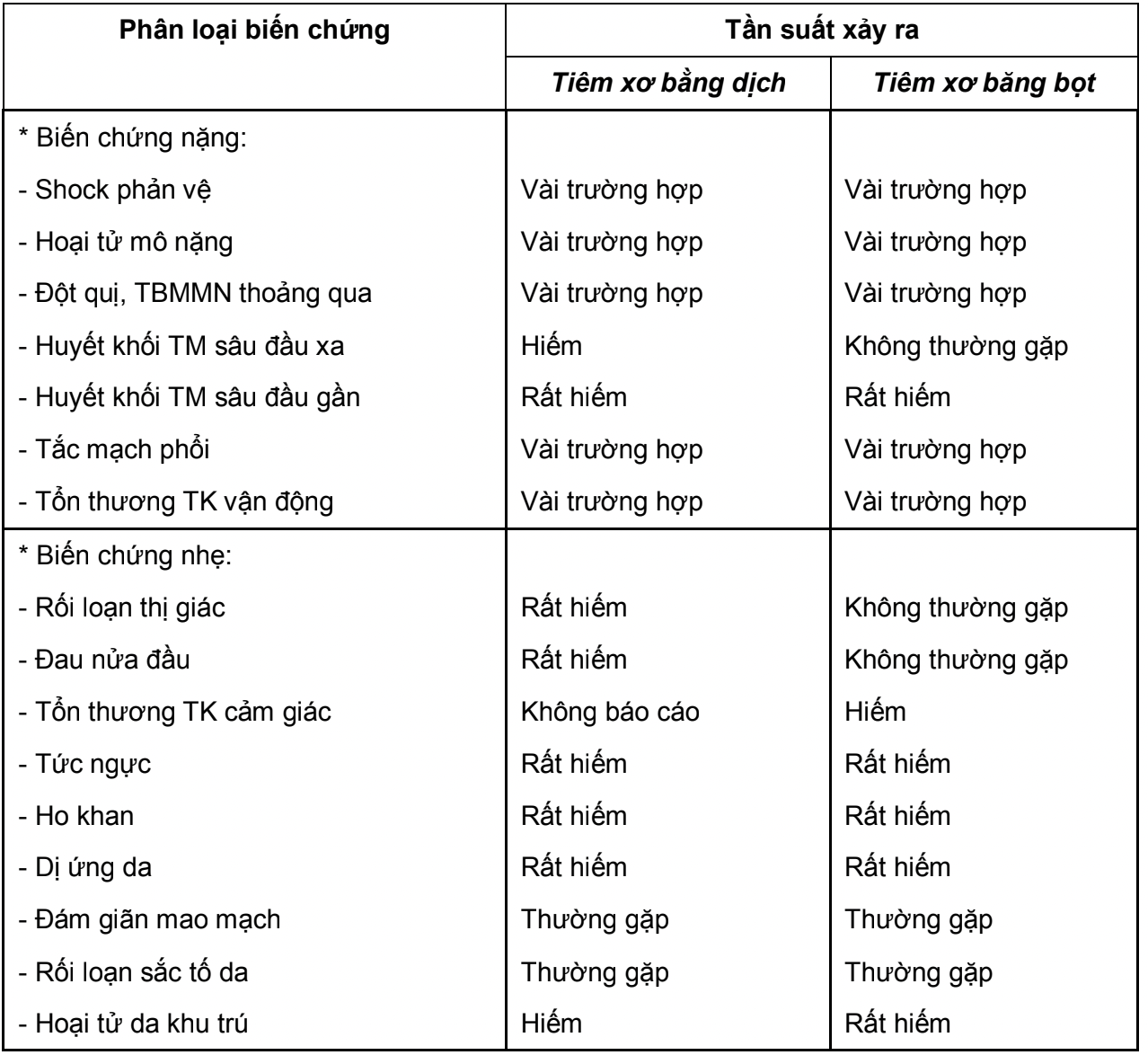 (*) Bảng tổng hợp các biến chứng của phương pháp tiêm xơ theo Hội Tĩnh mạch châu Âu (tỷ lệ biến chứng ≥ 10%: rất thường gặp; 1-10%: thường gặp; 0,1-1 %: không thường gặp; 0,01-0,1%: hiếm; < 0,01%: rất hiếm, vài trường hợp).