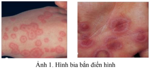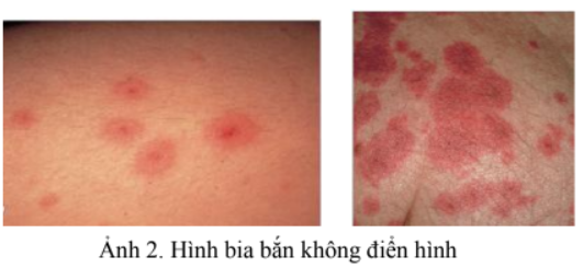- Thương tổn da đa dạng: hình bia bắn điển hình hoặc không điển hình, kèm theo có dát đỏ, sẩn phù, mụn nước, một số ít có bọng nước.
