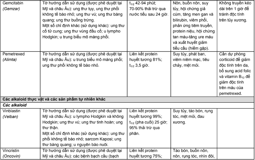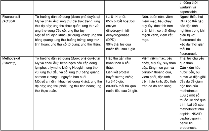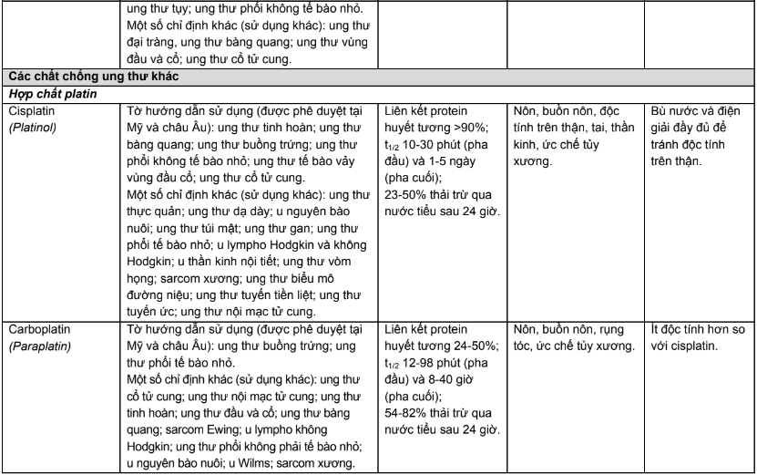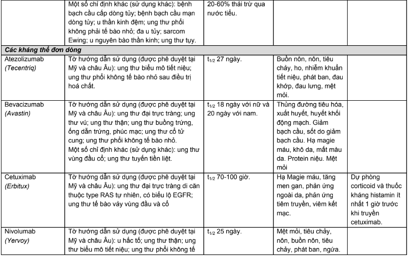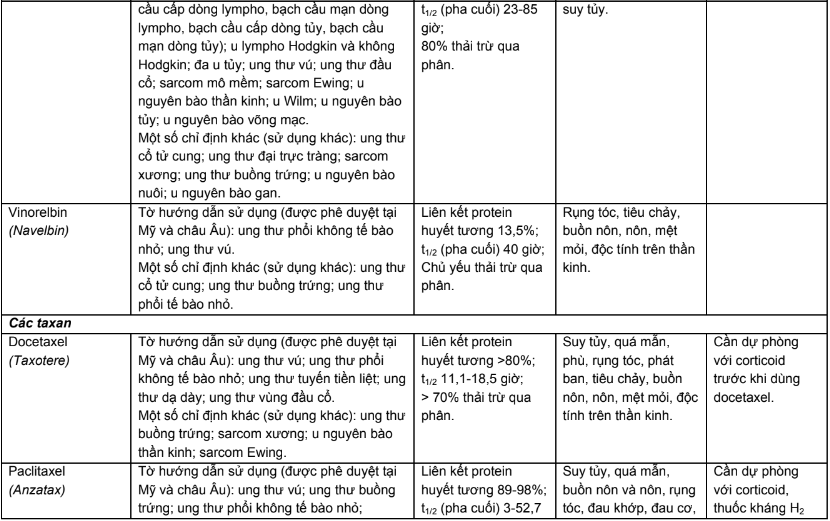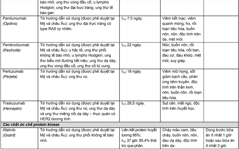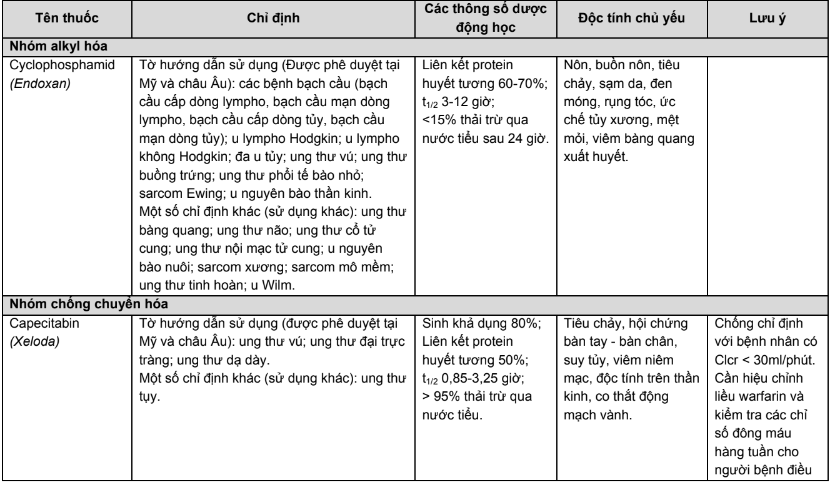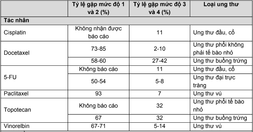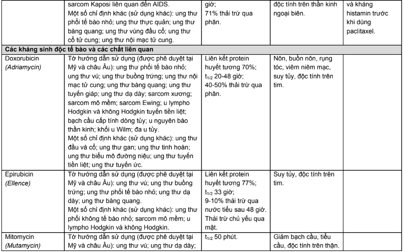 Bảng 1. Tóm tắt độc tính chính của các thuốc trị ung thư