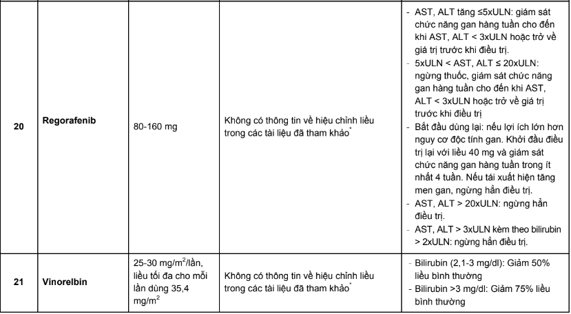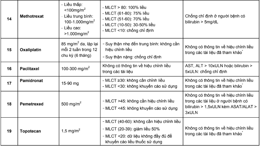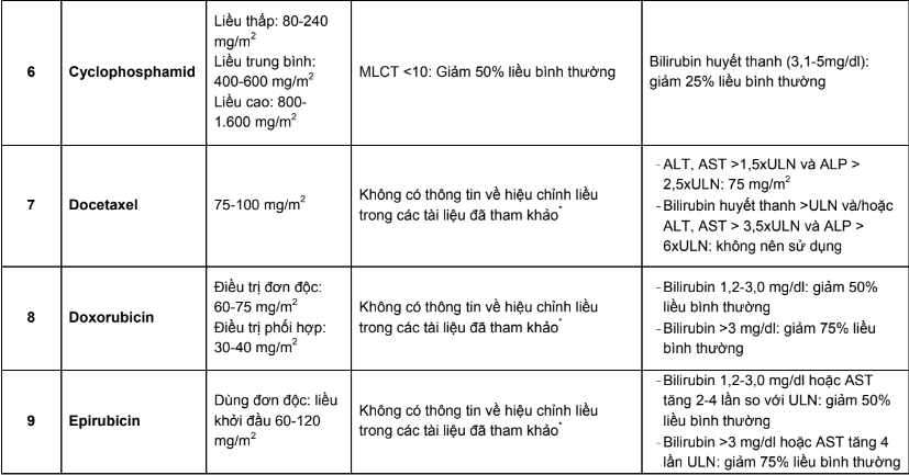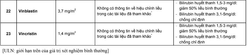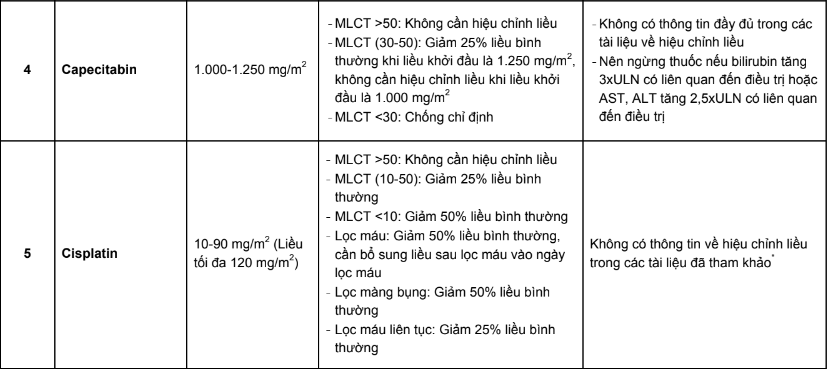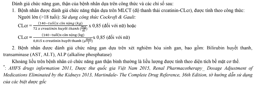 - Điều chỉnh liều dùng theo diện tích bề mặt cơ thể hoặc cân nặng; chức năng gan thận, độc tính của hóa trị (chủ yếu là tiểu cầu và bạch cầu trung tính).