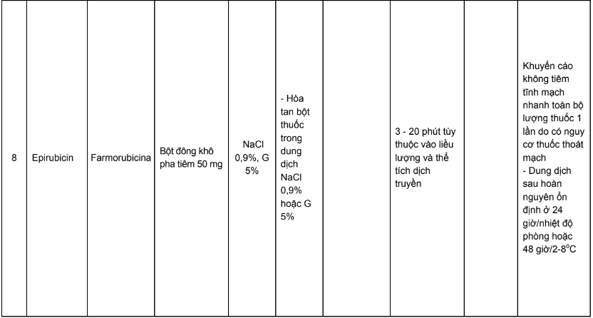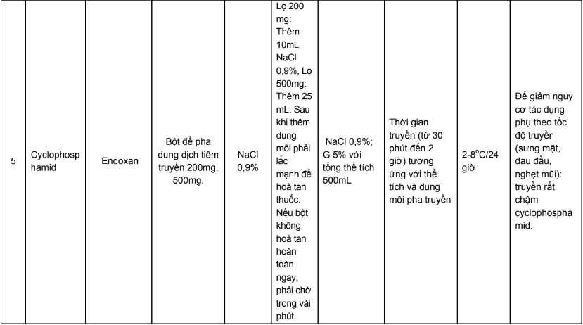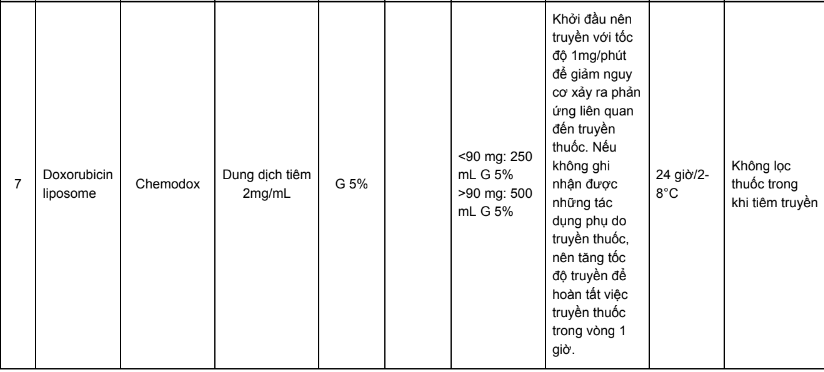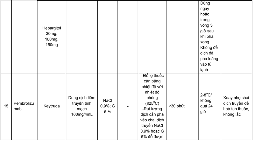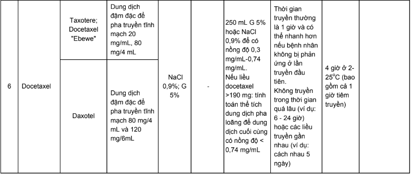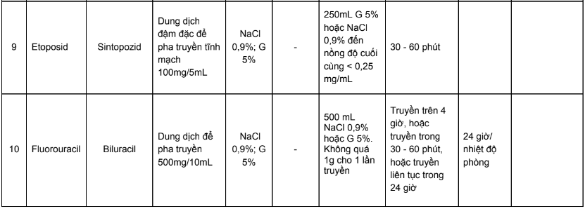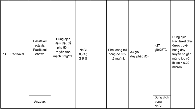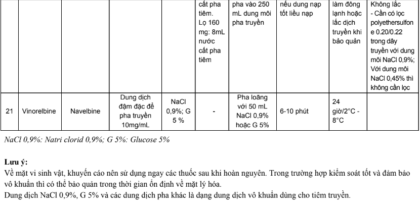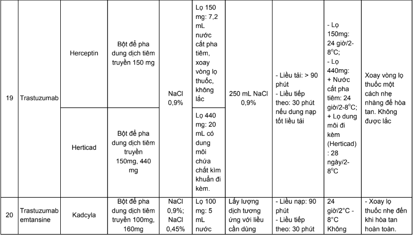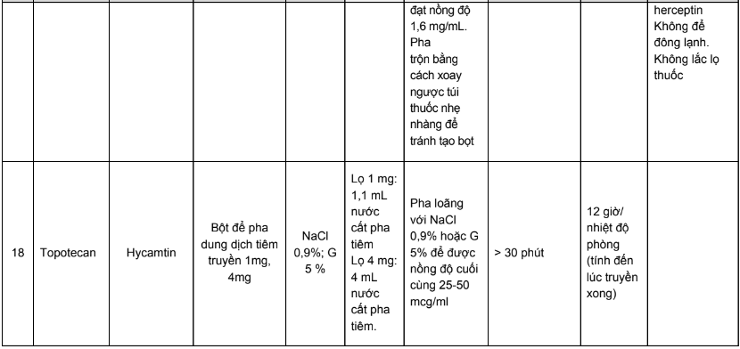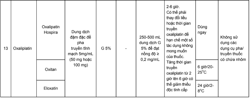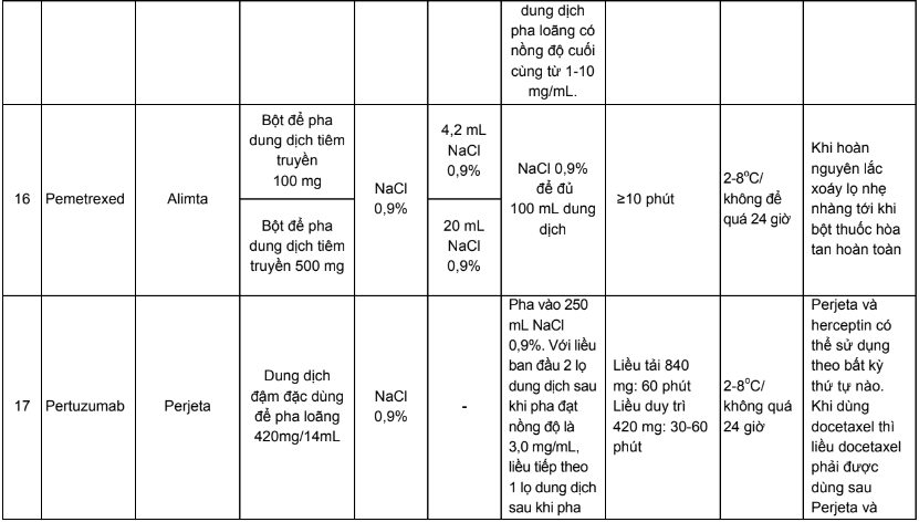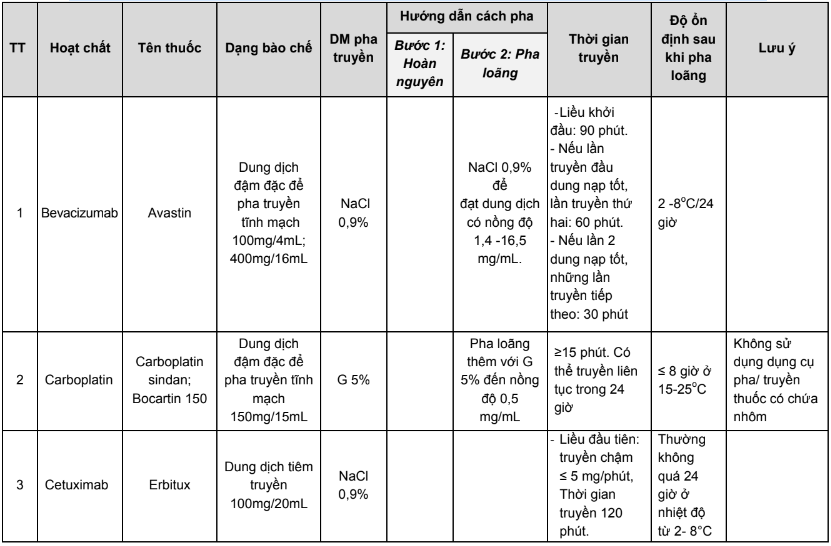 Phụ lục 3. Bảng pha truyền và độ ổn định sau khi pha của các thuốc điều trị 5 loại ung thư thường gặp tại Việt Nam