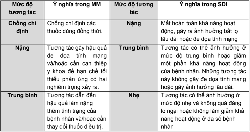 Bảng 2. So sánh phân loại mức độ nặng của tương tác trong MM và SDI