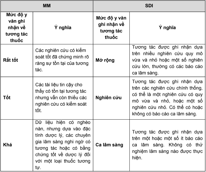 - Sau đây là các bảng phân loại mức độ nặng và mức độ y văn ghi nhận về tương tác của hai CSDL MM và SDI: