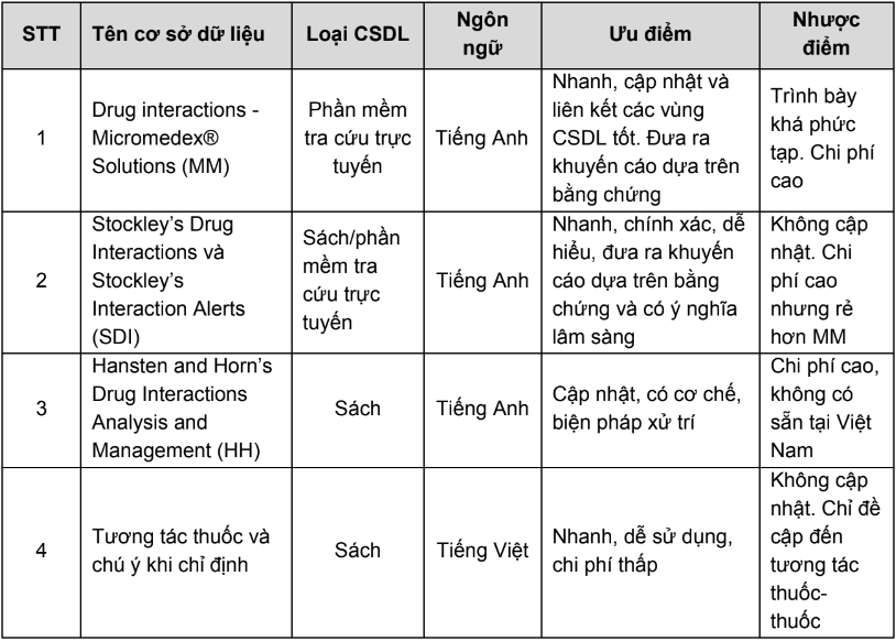 - Stockley’s Drug Interactions và Stockley’s Interaction Alerts (SDI): là CSDL dưới dạng sách/phần mềm tra cứu trực tuyến, là nguồn tài liệu toàn diện về tương tác thuốc và có trích dẫn các nguồn tài liệu có bản quyền trên toàn thế giới. Tương tác trong CSDL này bao gồm tương tác của các loại thuốc điều trị, dược liệu, thực phẩm, đồ uống, thuốc trừ sâu và một số thuốc bị lạm dụng. Mỗi kết quả tra cứu về một tương tác thuốc trong Stockley’s Interaction Alerts bao gồm các phần sau: tên thuốc (nhóm thuốc) tương tác, mức độ ý nghĩa của tương tác, hậu quả của tương tác, biện pháp kiểm soát tương tác và mô tả ngắn gọn về tương tác qua ba tiêu chí: mức độ can thiệp, mức độ nặng và mức độ y văn ghi nhận về tương tác.