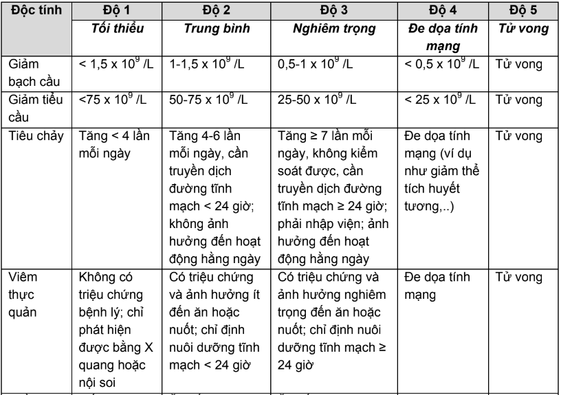 Độc tính của các thuốc điều trị ung thư được phân loại theo năm mức độ từ 1 đến 5 tương ứng với các mức tối thiểu, trung bình, nghiêm trọng, đe doạ tính mạng và tử vong được trình bày trong Bảng 2.PL4.10.