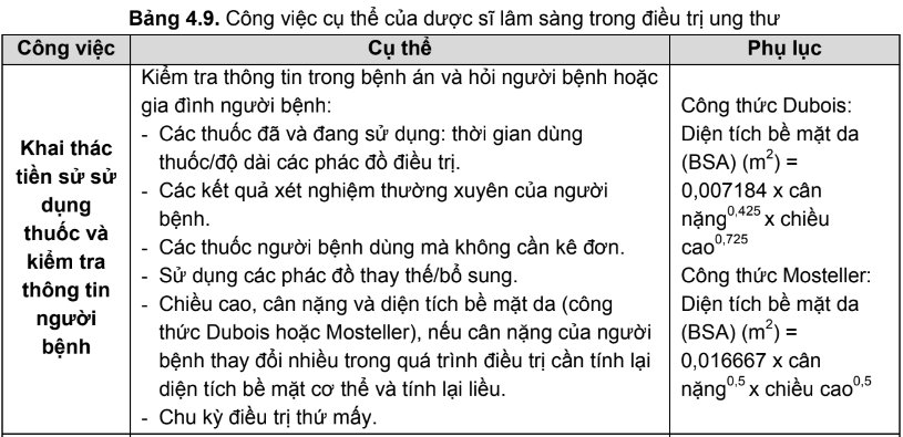 Ngoài các nội dung công việc chung như trong phần chương 1 của cuốn sách này, dược sĩ chuyên khoa ung thư cần lưu ý thêm các dữ liệu sau: