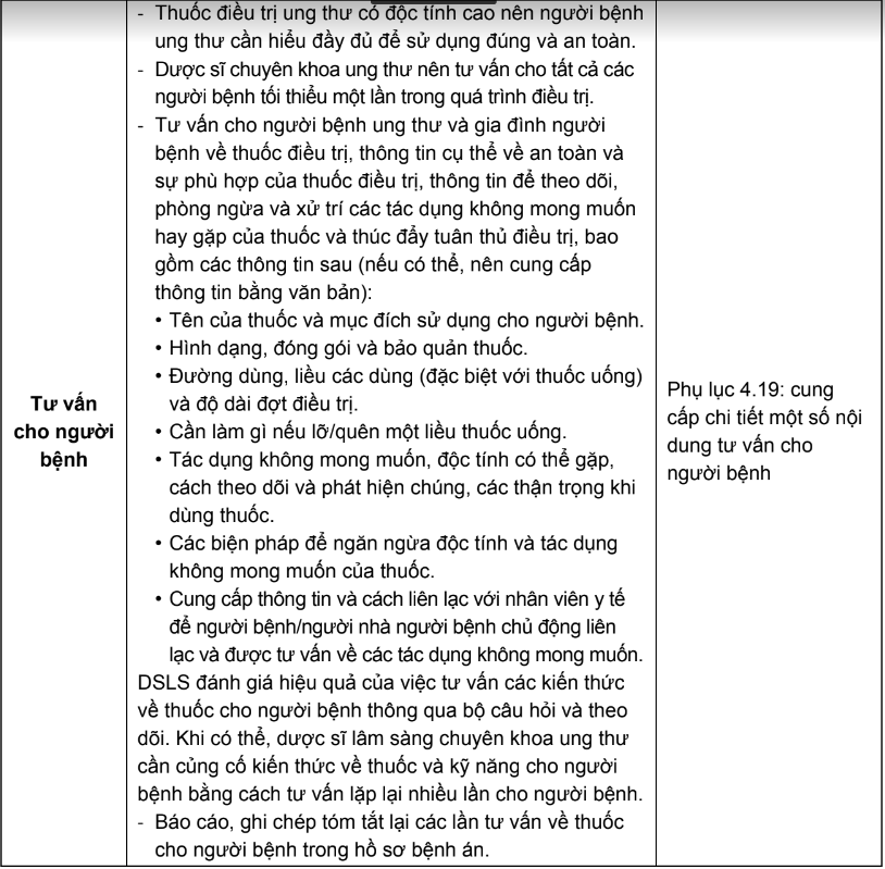 - DSLS chuyên khoa ung thư cần tham gia tất cả các hoạt động lâm sàng như thẩm định y lệnh, đi buồng, giao ban, báo cáo ca lâm sàng, hội chẩn đa chuyên ngành, tham gia ý kiến về điều trị cho bệnh nhân ung thư, thông tin thuốc, báo cáo ADR, nghiên cứu khoa học, viết báo, đào tạo và tập huấn.