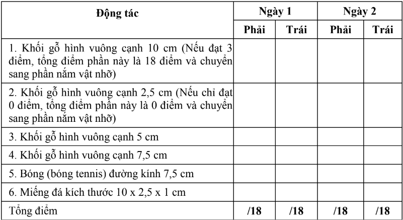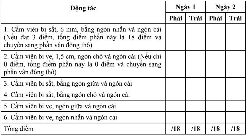 - Thang điểm bao gồm 4 nhóm vận động chính: cầm vật lớn, nắm vật nhỡ, kẹp vật nhỏ, các vận động thô.