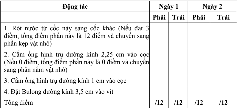 * Người bệnh thực hiện 19 động tác với các đồ vật được chia thành bốn nhóm vận động chính của chi trên: