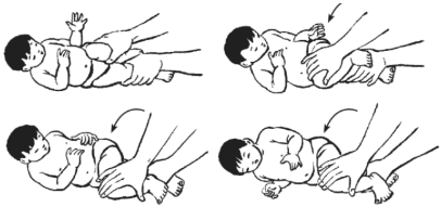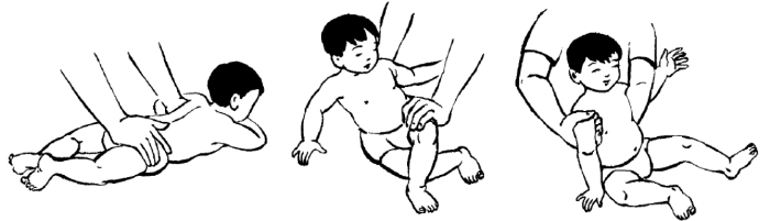 - Kỹ thuật: kỹ thuật viên ngồi phía dưới chân trẻ dùng một tay gập gối và háng một chân trẻ và nhẹ nhàng đẩy chéo vào bụng trẻ. Khi trẻ đ nằm nghiêng ta từ từ đẩy thân mình trẻ sang bên đó và đợi trẻ tự lật ngửa.