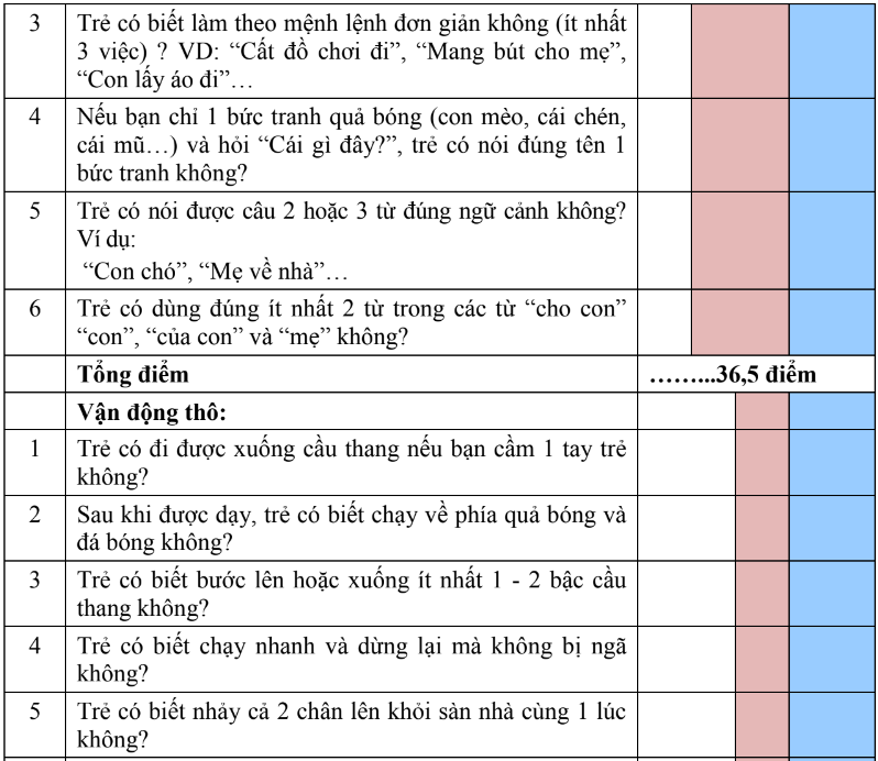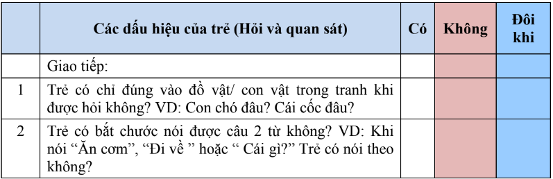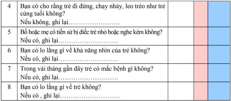 - Bước 2: đọc từng câu trong mỗi lĩnh vực. Hỏi cha mẹ kết hợp với quan sát trẻ.