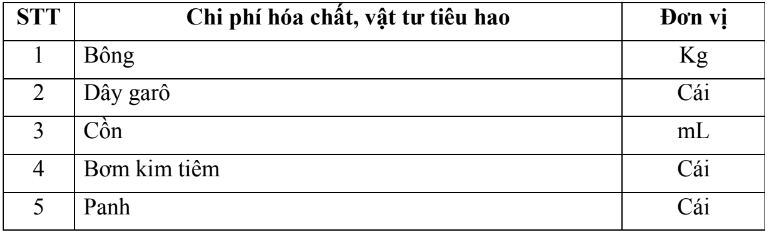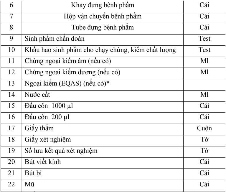 * Ghi chú: Chi phí ngoại kiểm cho quy trình kỹ thuật được tính cụ thể theo Chương trình ngoại kiểm (EQAS) là 1/50 tổng chi phí dụng cụ, hóa chất, vật tư tiêu hao (với số lần ngoại kiểm trung bình 4 lần/1 năm).