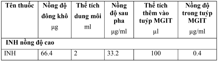 - Chỉ định INH nồng độ cao, dán nhãn 2 tuýp MGIT 7 ml theo thứ tự: GC, INH và tuýp PNB (nếu cần)