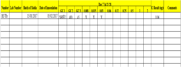 - Bước 1: Kiểm tra kết quả KSĐ c a ch ng đối chứng H37Rv. Đầu tiên, kiểm tra số lượng khuẩn lạc trên các đĩa môi trường không chứa thuốc kháng sinh, Đạt tiêu chuẩn là 50 khuẩn lạc / đĩa 10-5, 500 khuẩn lạc / đĩa 10-4, 5000 khuẩn lạc / đĩa 10-3. Sau đó, kiểm tra các đĩa môi trường chứa thuốc kháng sinh. Ghi nhận kết quả MIC đĩa môi trường có nồng độ thuốc thấp nhất mà không có khuẩn lạc mọc. Giá trị MIC c a ch ng H37Rv chấp nhận được trong khoảng 0.015 – 0.12 ug/ml. Nếu giá trị MIC c a H37Rv nằm ngoài khoảng trên thì cần thực hiện lại KSĐ.