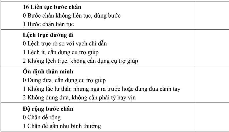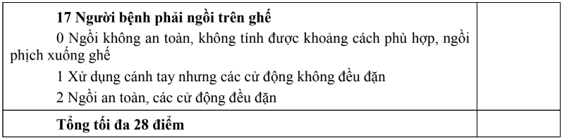 - Tổng điểm < 20: nguy cơ ngã rất cao.