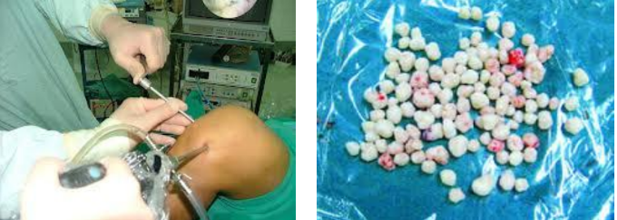 Hình minh họa: nội soi khớp gối (ảnh trái) và hình ảnh u sụn màng hoạt dịch lấy ra từ trong khớp (ảnh phải).