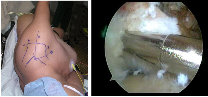 Hình minh họa: nội soi khớp vai trái tư thế nằm (hình bên trái) và hình ảnh cắt lấy tổn thương sụn bên trong (hình bên phải).