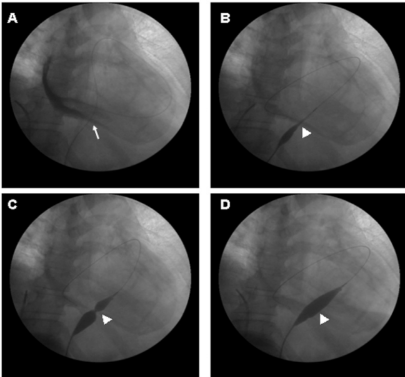 Hình 1. Quá trình nong bóng màng ngoài tim dưới màn tăng sáng