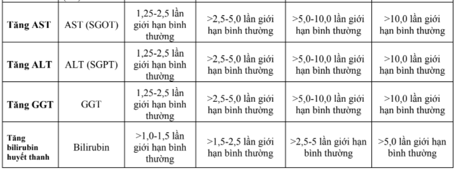 Cân nhắc hướng xử trí dựa trên triệu chứng nhiễm độc gan và tăng men gan với các mức độ sau