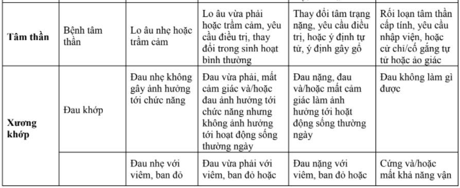 - Mức độ 4: Giới hạn hoạt động rất nghiêm trọng, yêu cầu có sự hỗ trợ đáng kể, yêu cầu can thiệp y tế / liệu pháp điều trị đáng kể, yêu cầu phải nhập viện hoặc điều trị cấp cứu.