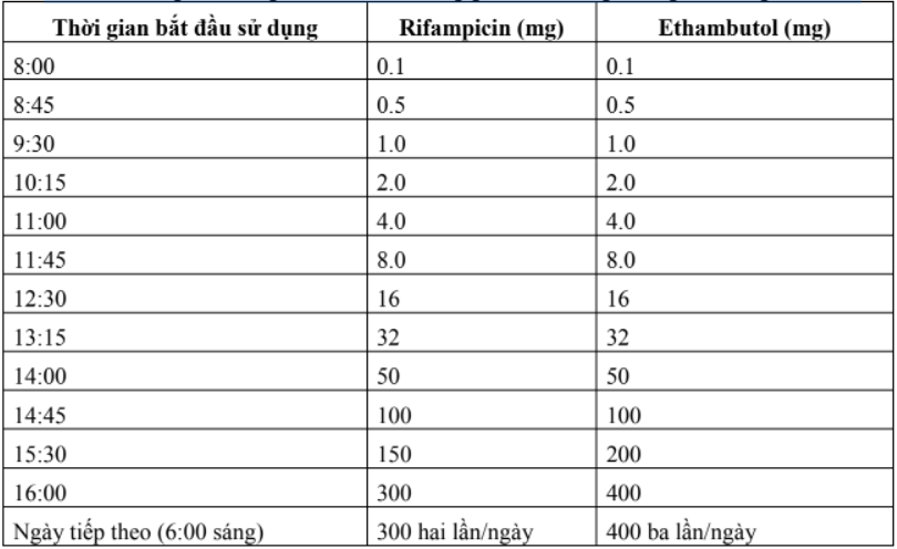 - Giải mẫn cảm nhanh với Rifampicin và Ethambutol tham khảo theo bảng dưới, thực hiện liều và khoảng cách tăng liều dựa trên lượng giá triệu chứng ở từng cá thể người bệnh.