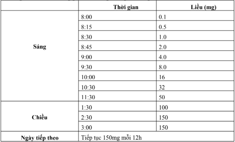 - Tăng liều gấp đôi sau mỗi 15 – 20 phút, kéo dài vài giờ cho đến khi đạt liều điều trị.