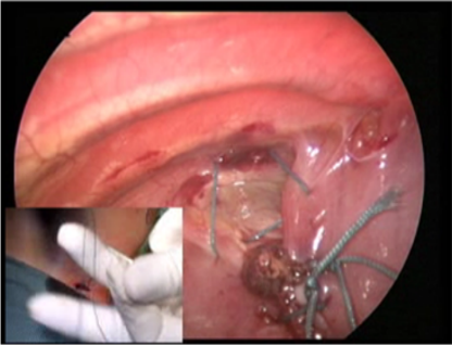 - Nếu thoát vị có bao thoát vị: có thể cắt màng bọc rồi khâu 2 mép cơ hoành hoặc khâu gấp nếp. Khâu bằng chỉ Ethibon 2/0 hoặc 3/0. Các nút buộc làm từ trong hay bên ngoài. Có thể dùng mảnh ghép khi lỗ thương tổn lớn hay kết hợp khâu vào thành ngực (Hình 2).