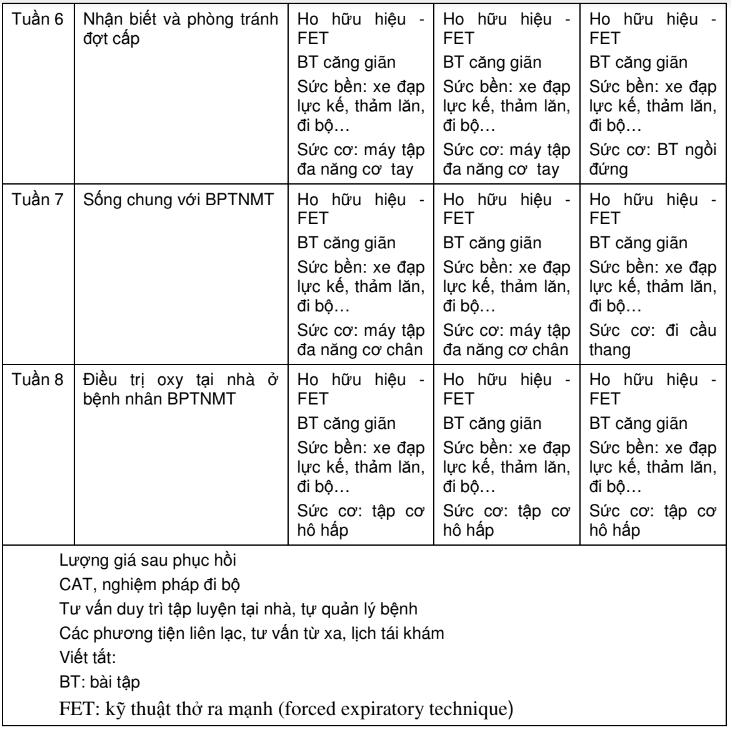 − Các phương pháp tập thở: bao gồm thở chúm môi, thở ra chủ động, các tư thế đối phó khó thở và cách phối hợp giữa tập thở và các hoạt động thường ngày.
