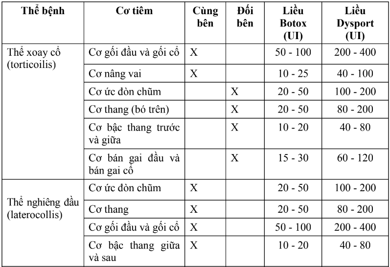 - Tiêm Botulinum toxine nhóm A vào vị trí đ được xác định (cơ và liều tiêm theo bảng ở dưới).