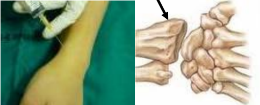 Hình 1: Kỹ thuật tiêm điểm bám gân mỏm trâm quay