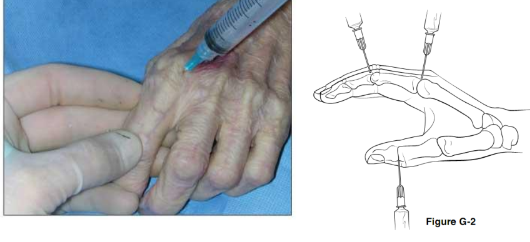 - Tiến hành tiêm khớp : tiêm khớp ở mặt mu tay, đâm kim vào khe khớp bàn ngón vị trí cạnh gân duỗi ngón. Hút thử pitton ra không thấy có máu thì tiêm thuốc vào nhẹ tay là được.