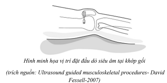 - Bác sỹ xác định vị trí đặt đầu dò theo mặt thẳng ở vị trí trên xương bánh chè, bên ngoài gân cơ tứ đầu đùi theo mặt cắt song song với xương đùi; hoặc để đầu dò tại vị trí trên ngoài xương bánh chè theo mặt cắt vuông góc với xương đùi để đưa kim vào ổ khớp an toàn, thuận lợi.