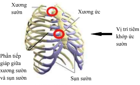 - Xác định vị trí tiêm: sờ khớp ức sườn bằng cách lần đầu ngón tay vào đầu trong xương sườn định tiêm, phần tiếp giáp với cán ức.